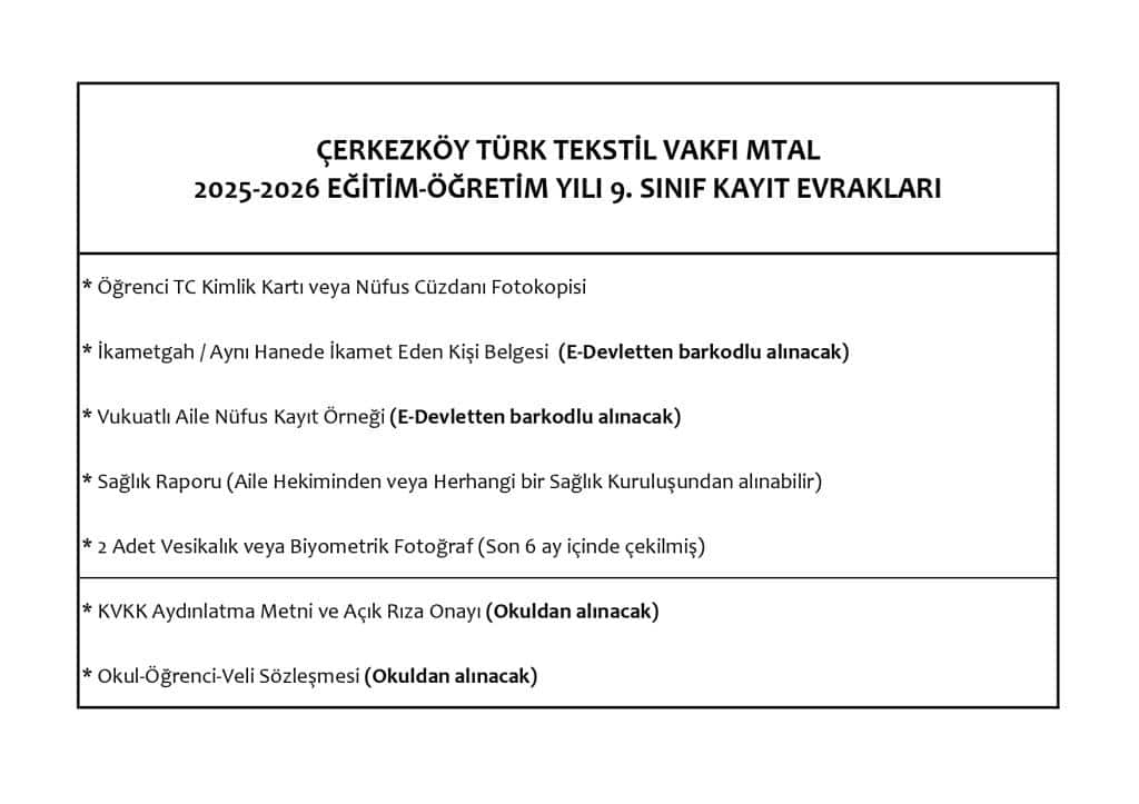 2025-2026 Eğitim-Öğretim Yılı 9. sınıf öğrencilerimizin kayıt süreci devam ediyor.